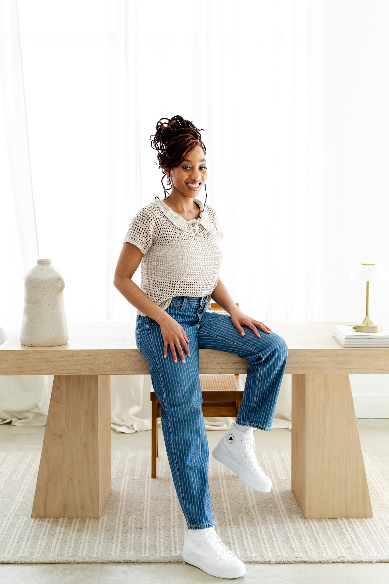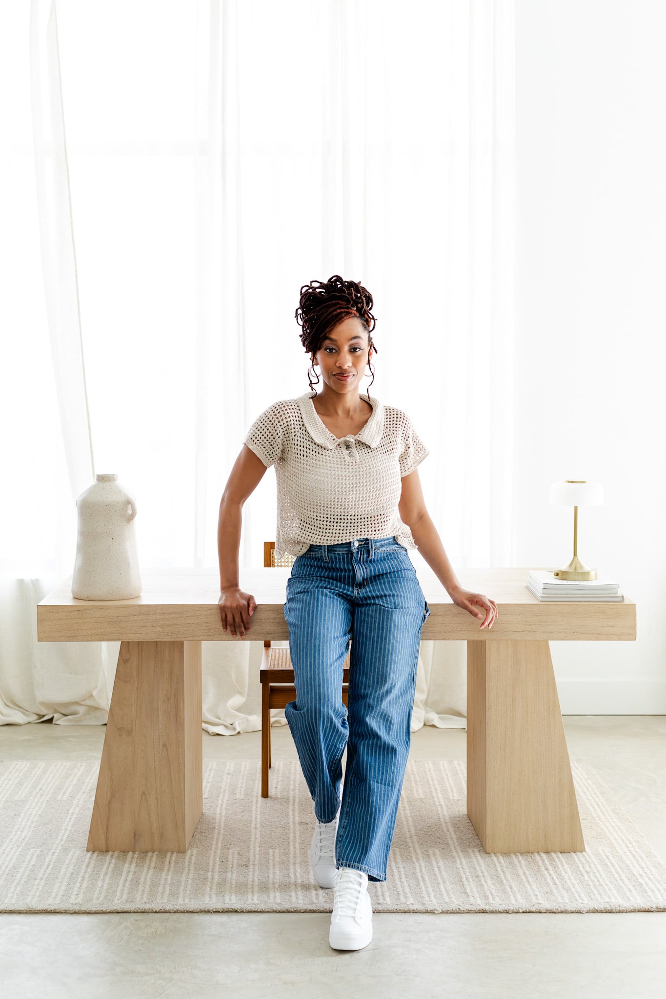 The Alabaster Cream colorway deserves a specific mention because it showcases the mesh texture in a way that busier colors can obscure. If you really want to see what this stitch does, a light, solid, or near-solid color will show off every detail. That said, the Luther Top in a soft sage, a warm terracotta, or even a classic navy? Completely stunning.