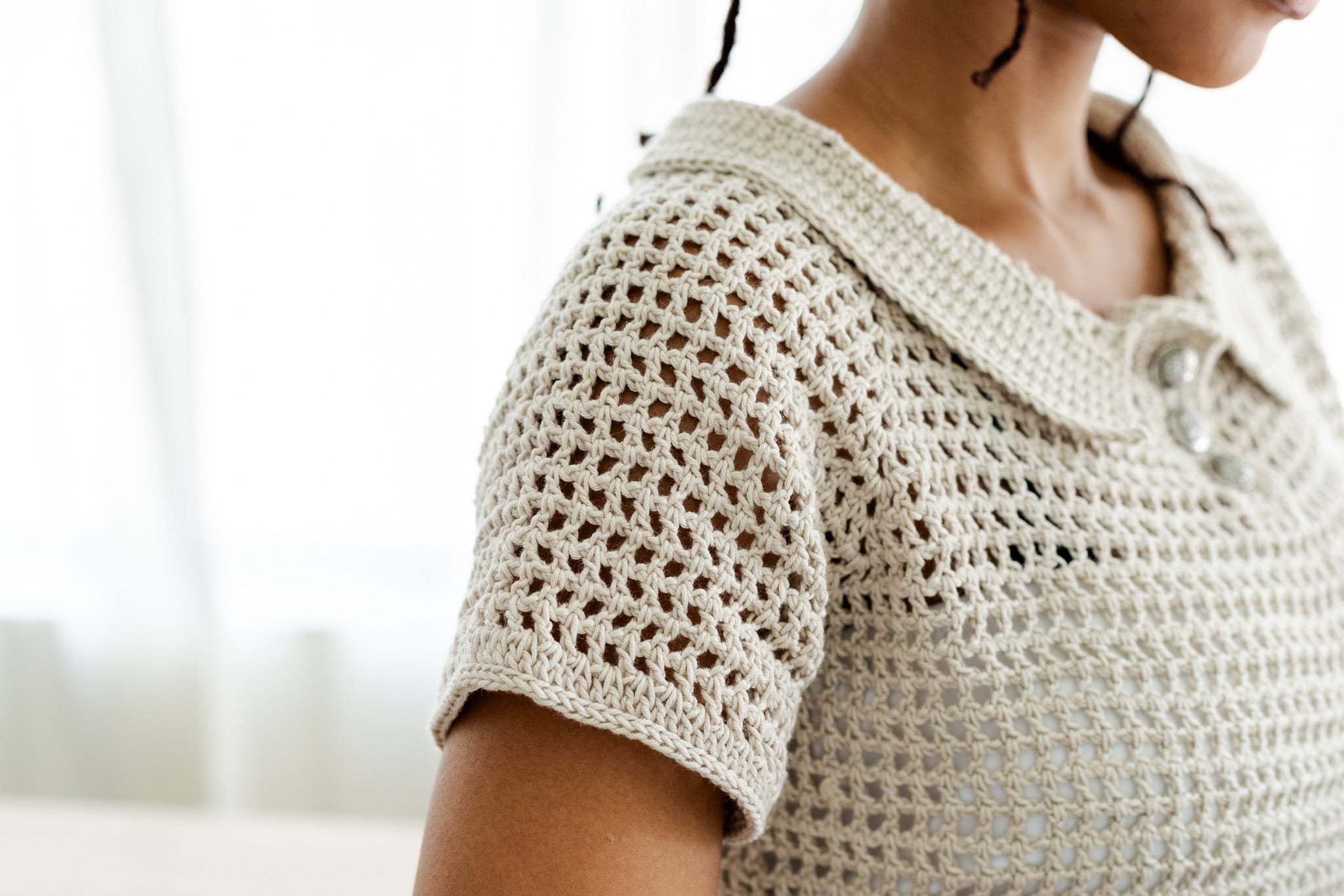 // The three-button functional placket is the second standout detail, and functional is the keyword there — those buttons actually work. The placket adds structure to the front neckline of our crochet mesh tee, makes getting the top on and off a breeze, and gives you a little moment to have fun with your notions choices. Vintage buttons? Statement buttons? Subtle matching buttons? All correct answers.