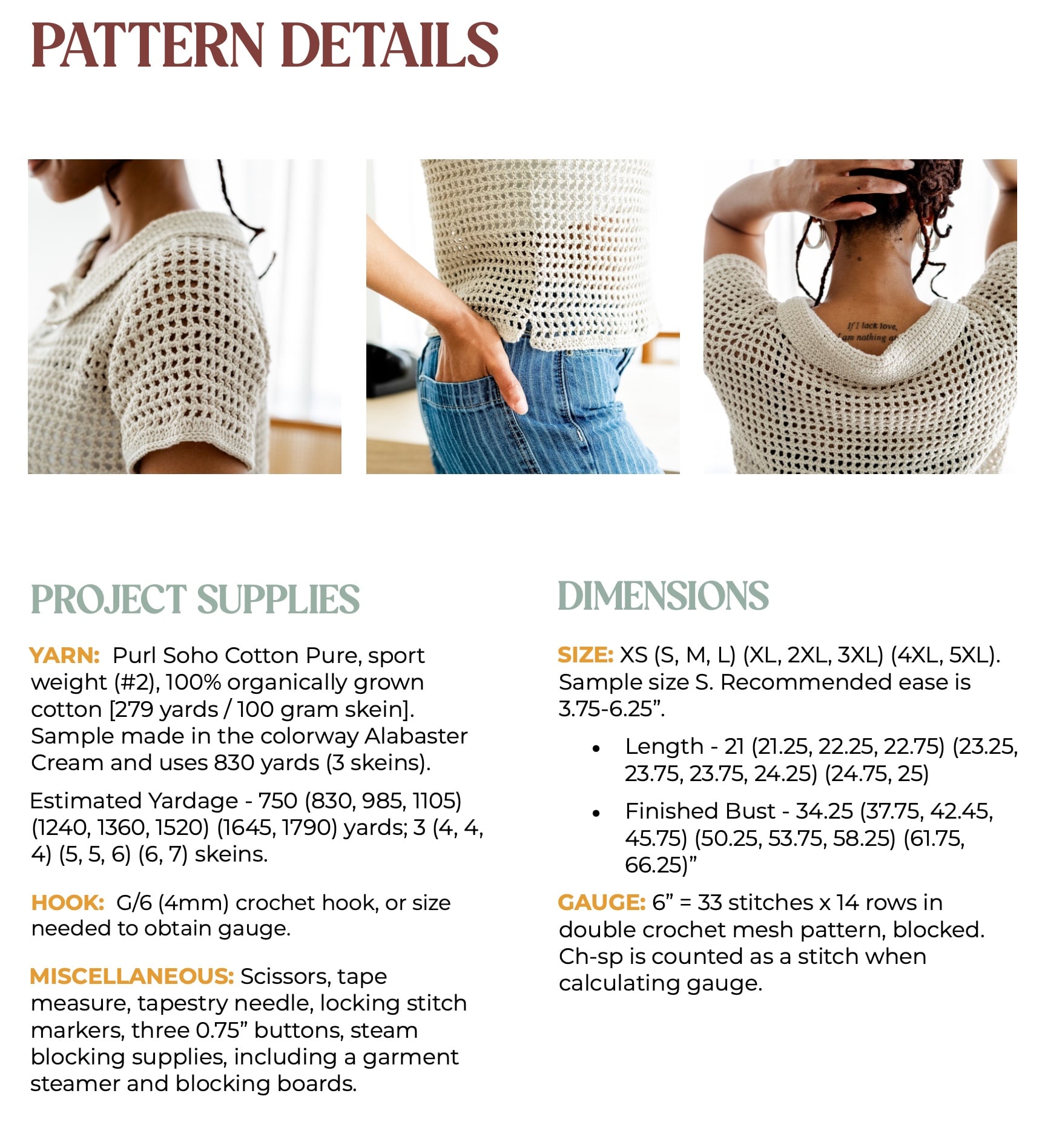 - FIBER: Cotton or a blend that is mainly cotton is stronly recommended. Cotton gives you the drape and breathability that make this crochet mesh tee effortlessly wearable. A cotton-linen blend is a lovely option that adds some welcome texture. Avoid wool or wool-heavy blends unless you’re planning to wear your top in the fall.