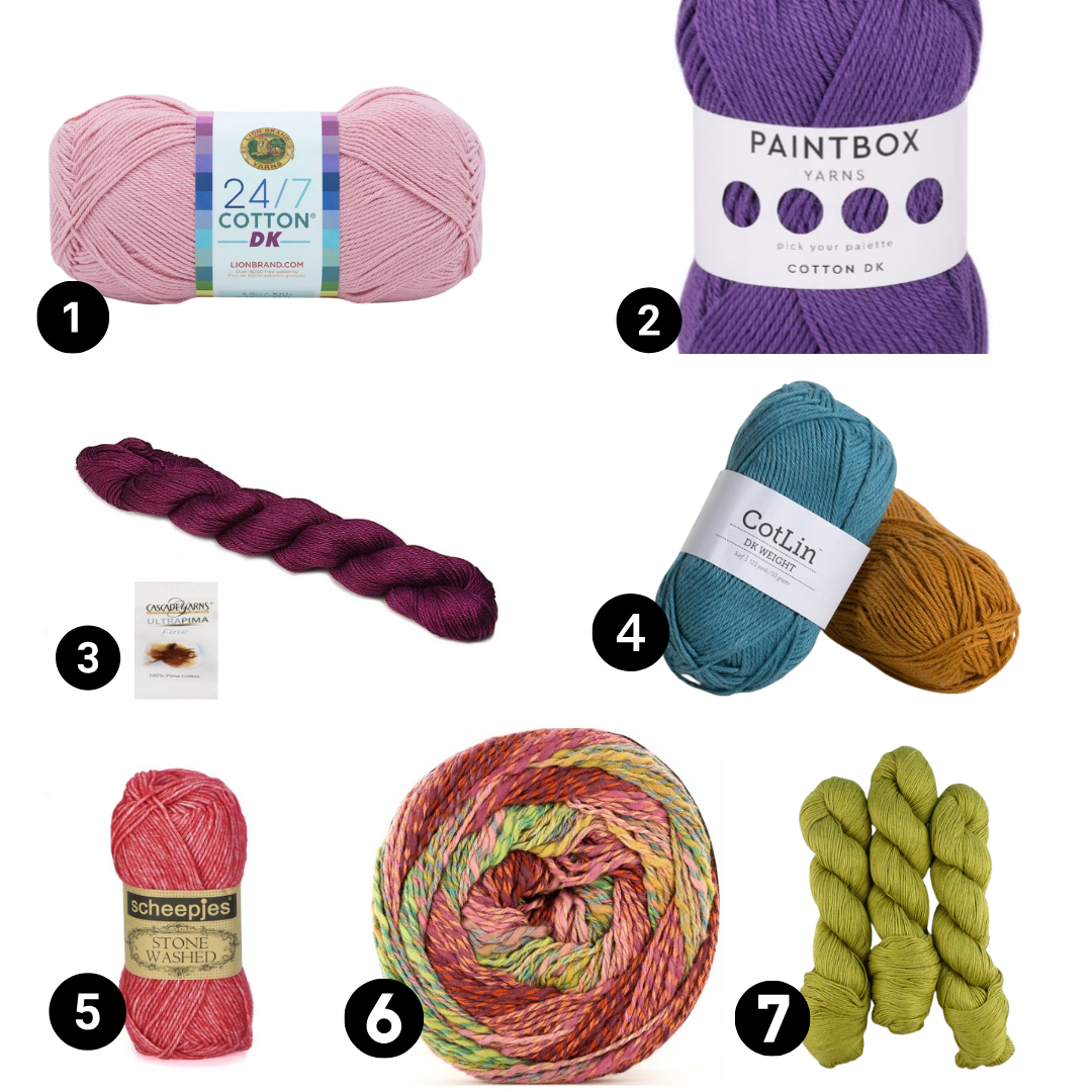 1 // Lion Brand 24/7 Cotton DK ($5.99/ 100-gram skein). Widely available, affordable, and offered in timeless colors. This one has nearly the same yardage as the original yarn, so you can expect similar performance.