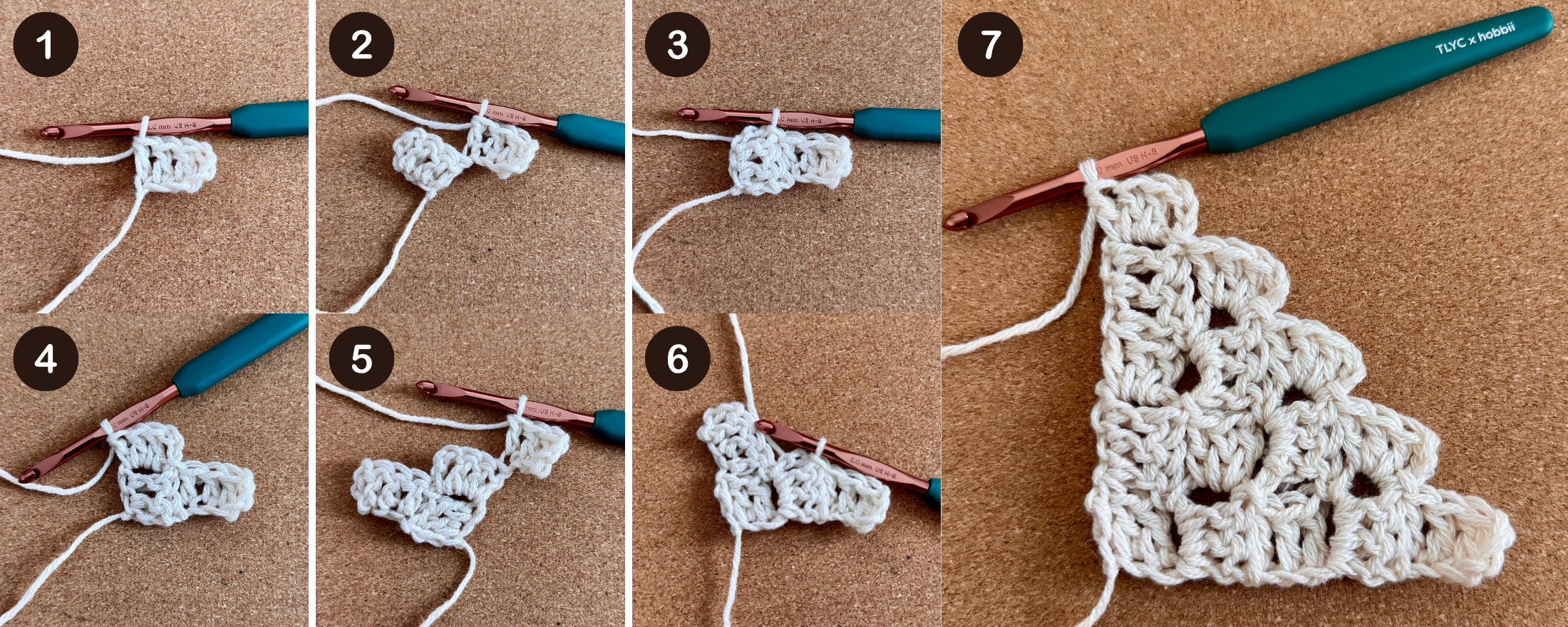 Increase Row: Ch 6. Dc in the 4th ch from the hook and each of the 2 remaining chs. Turn the tile made in the previous step (Image 2). Sl st in the ch-3 space of that tile to join (Image 3). Ch 3, dc 3 times in same ch-3 space (Image 4).