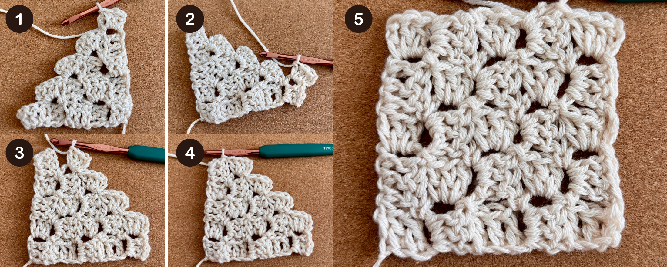 This is the first square of your project. It lies at the bottom-left of the project if you are a right-handed crocheter. This square is your “anchor” piece. All squares will be the same size as this one.