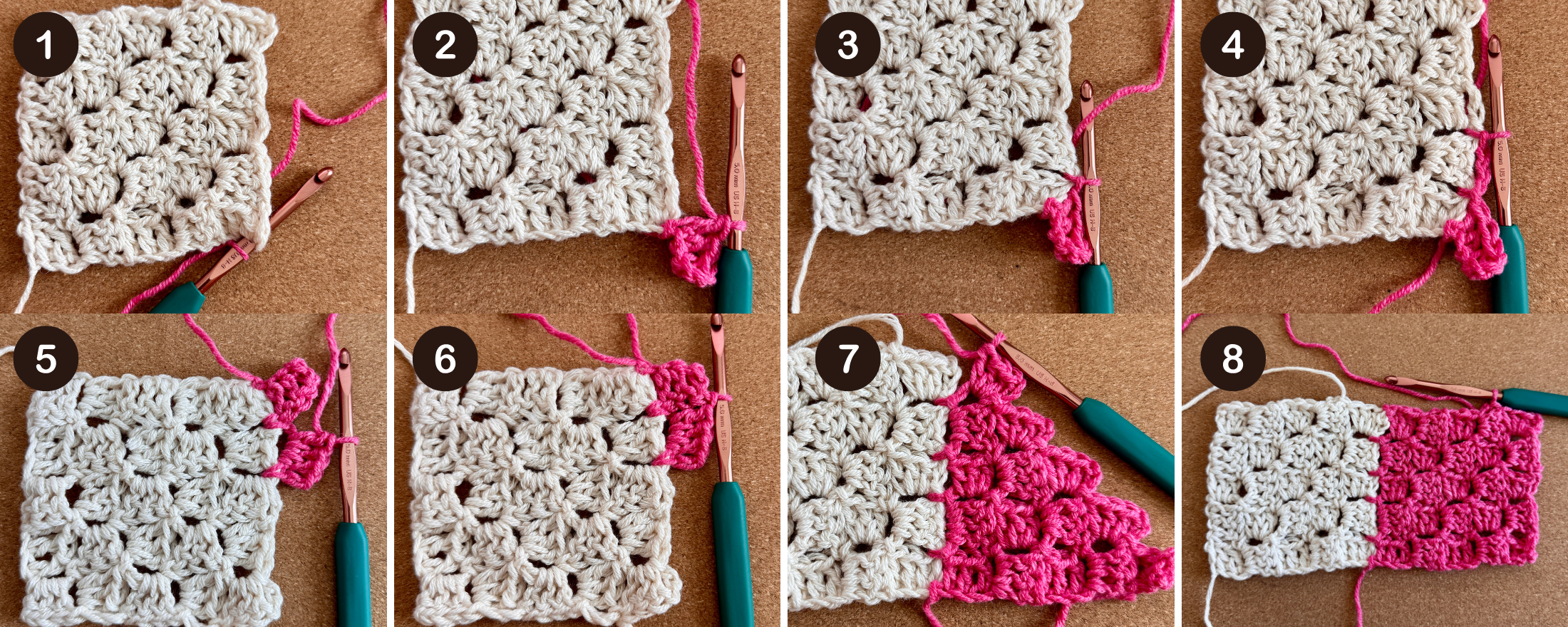 Join Between Square 1 and Square 2: When you reach the end of the Increase Rows, your final join is in the space between the square you’re joining to, and the next square. At the end of the row, sl st into the sp between the next 2 tiles on Square 1. Ch 3, sl st in the space between the last tile of Square 1 and the first tile of Square 2 (Image 6). Turn your work and complete the final Increase Row.